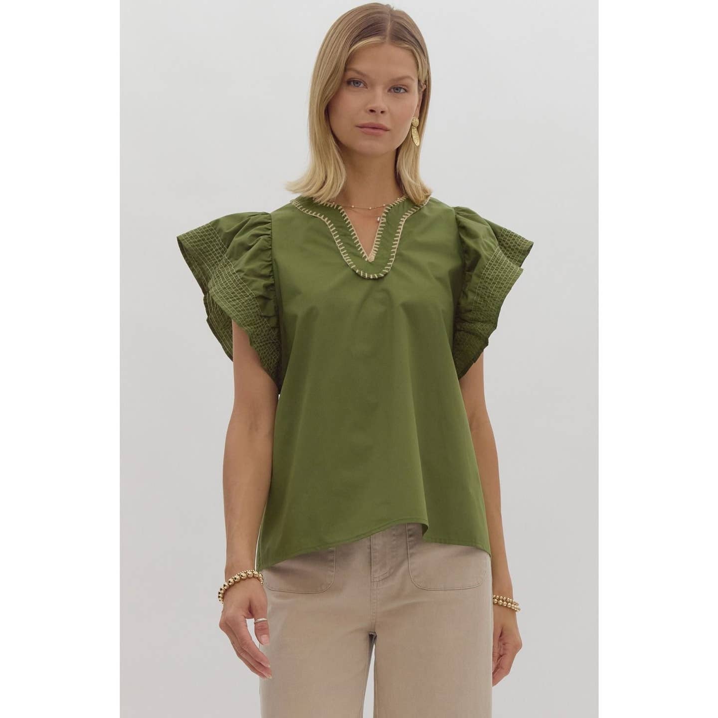 This olive top with a dramatic ruffle sleeve is the perfect transition top for fall 🧡